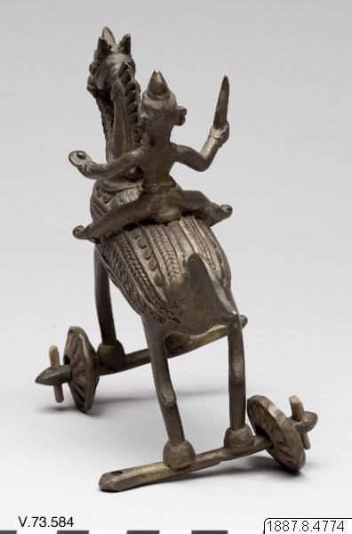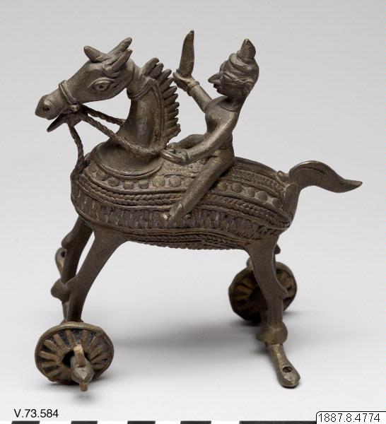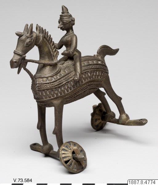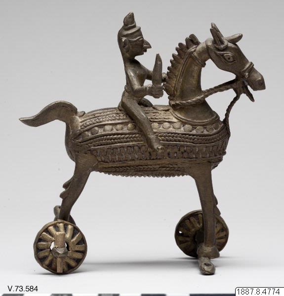 • Ryttare på häst. (generalkatalogen) Hästen står på två hjulaxlar med hjul fastsatta med träplugg, endast ett hjul på varje axel finns bevarade.
