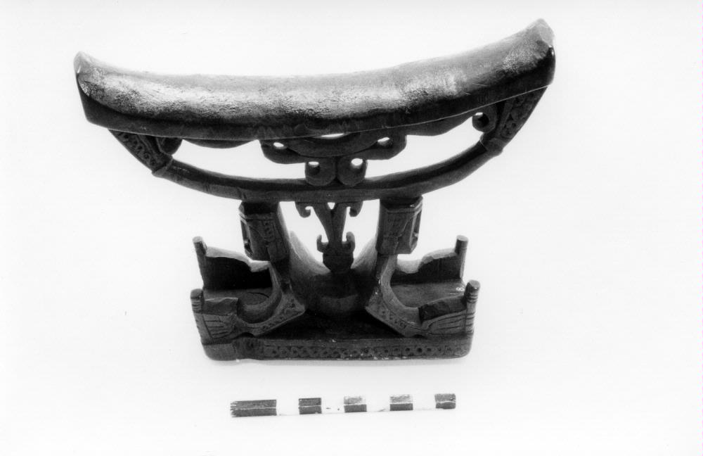 Huvudgärd, rikt snidad (enligt generalkatalogen). Nackstöd, två liggande figurer, sirligt ornamenterad. Svarta färgpigment. (enligt Regius, Hélena).