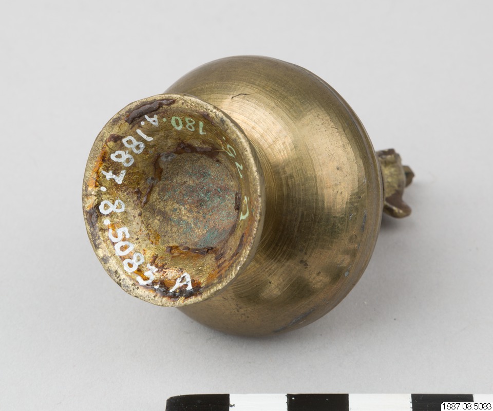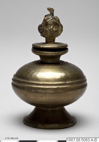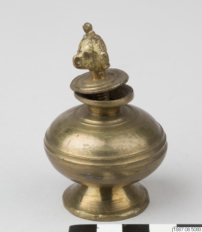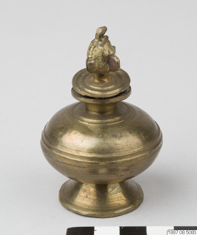 Kärl för vatten, litet, med Mahadeo-huvud på locket. Enligt uppgift köpas sådana kärl av pilgrimer från Dekkan att hemföra ganges-vatten i. De liknar snarare en Surma-dan. (generalkatalogen) Gangnes är en flod i Indien, men det är mer än bara en flod. Det är en helig flod som vakas över av den hinduiske skyddsgudinnan Ganga. Vattnet anses rena och hela den som badar i det, i stor kan vattnet ses förlänga den eviga saligheten. Många indiska hinduer vallfärdar till Gangnes för att bada i dess vatten och/eller sprida kremerade släktningar. Vid besöken tars ofta vatten med hem. Detta vatten ses bära flodens styrka och helighet och används vid religiösa ceremonier. Vattnet kallas Ganga jal (översättning "Gagnes vatten").