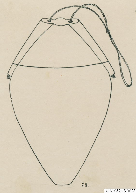 Mo Av trä, form enligt figur. Försett med lock, som löper på två snören. Den avsmalnande bottnen slutar med ett tunt hål, där förmodligen någon propp suttit. Kärlets mörka, vackert patinerade yta är helt täckt med inristade orneringar, vilka omedelbart fortsätta på locket. De ornerade fälten skiljas av vertikalt gående bandformiga, släta ytor. (Sprickor såväl i locket som kärlets nedre del). Höjd: 25 cm. Största diam.: 13.2 cm. [ocr]