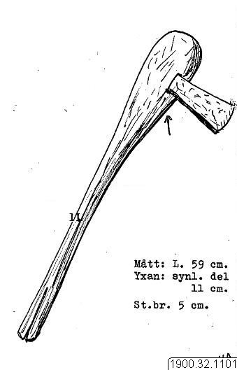 Yxa av järn med skaft av ljust trä. Yxbladet instucket i "dornfassung" i skaftet c:a 8 om från skaftets övre ända. Skaftets längd: 59 cm. Skaftets huvud: ca 8 cm brett. Dess yttersta ända : 3 cm i diam. Den synliga delen av yxbladet; 11 cm lång. Yxans bredd över eggen: 5 cm Yxans bredd vid skaftet: 2 cm. [ocr]