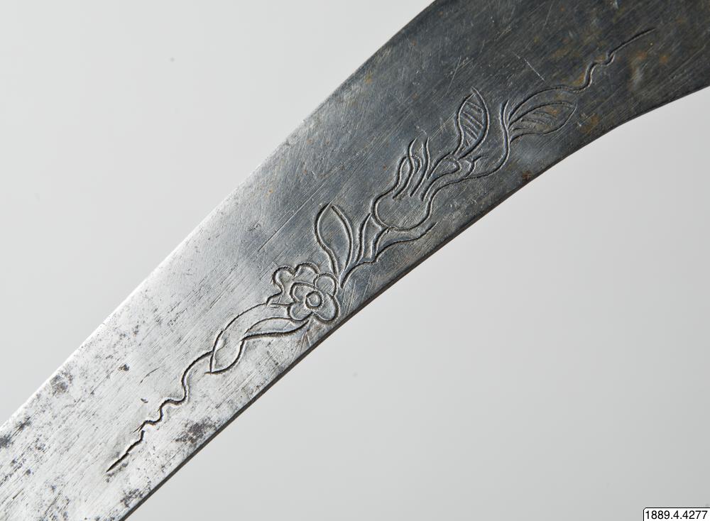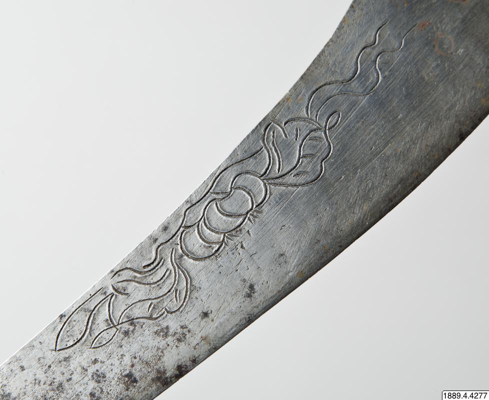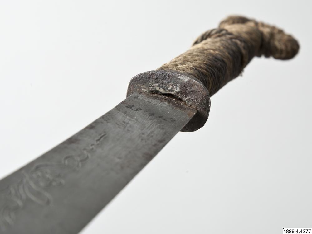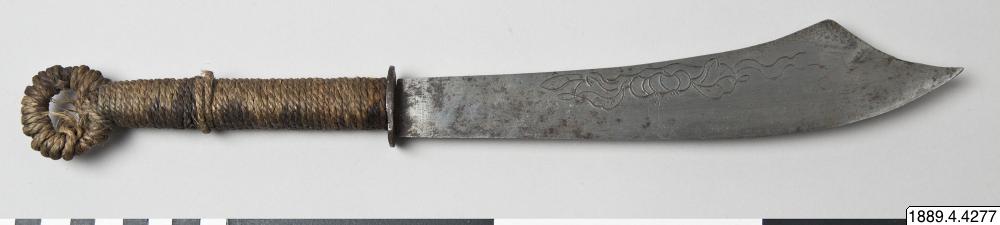 Dolk, Tonking (Vietnam).Klinga eneggad, därefter breddad under svängning tills den bildar knä och spetsas framåt. I knäet en rund urtagning fylld med ett mässingskors. På klingans båda sidor punsade ornament. Fäste med oval parerplåt av stål, mm och en rundad, fyrsidig kavel av trä, lindad med violett segelgarn(?). I spetsen en fast, uppträtt ring av stål, klädd som kaveln.