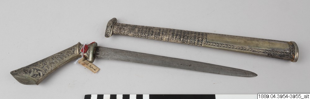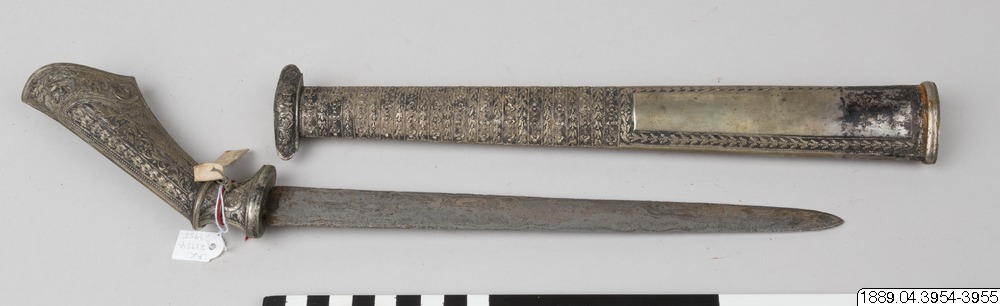 Dolk. Klinga, grovt damaskerad, tvåeggad. Fäste belagt med vitmetallbleck med drivet och ciselerat blommönster.