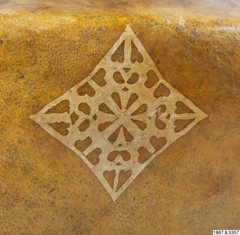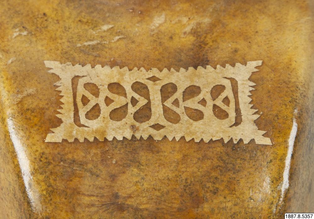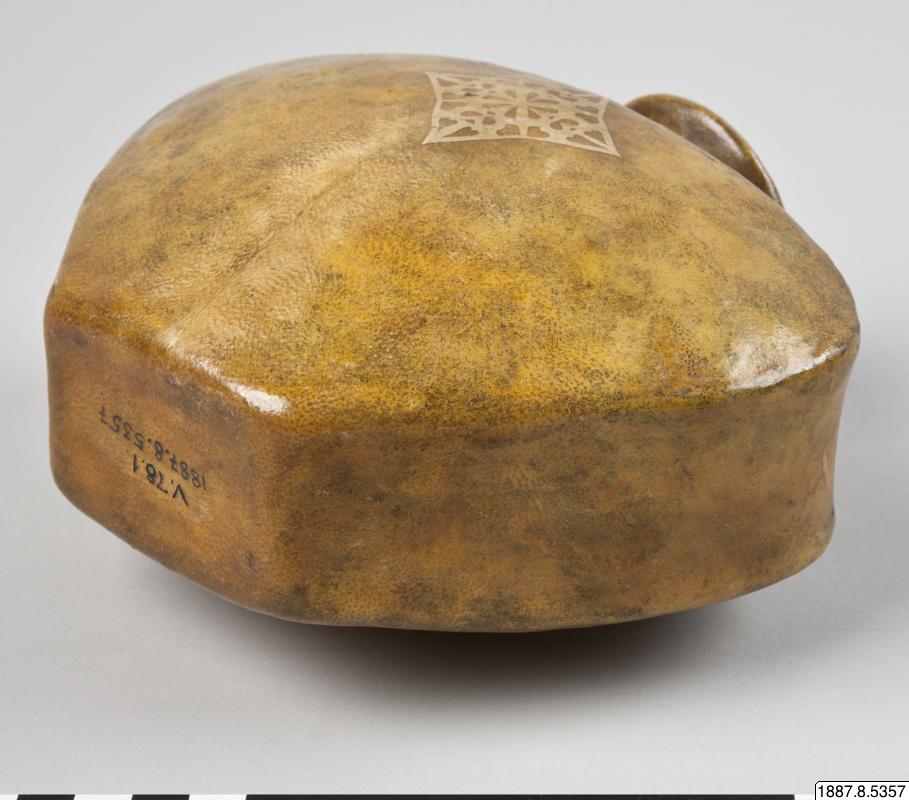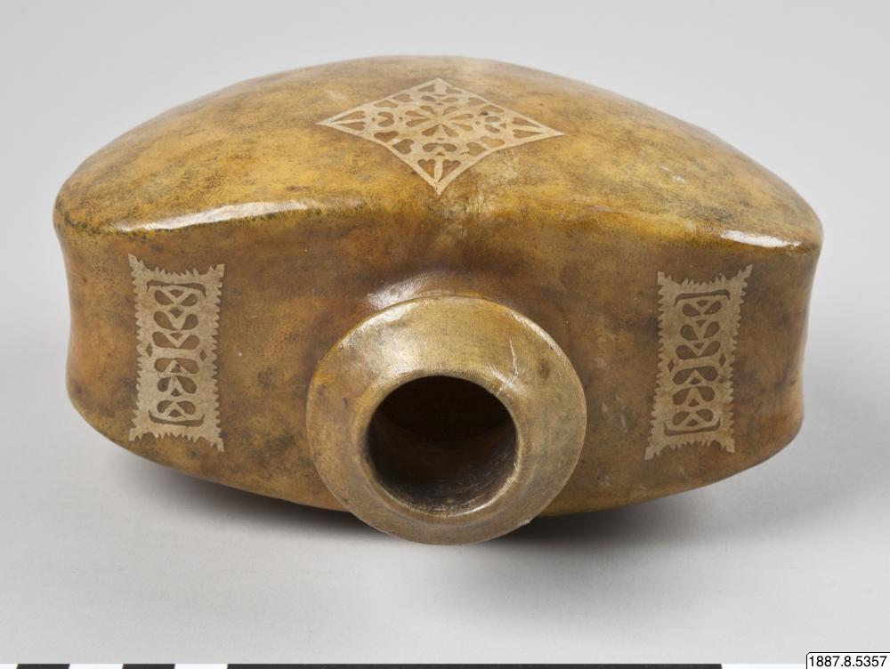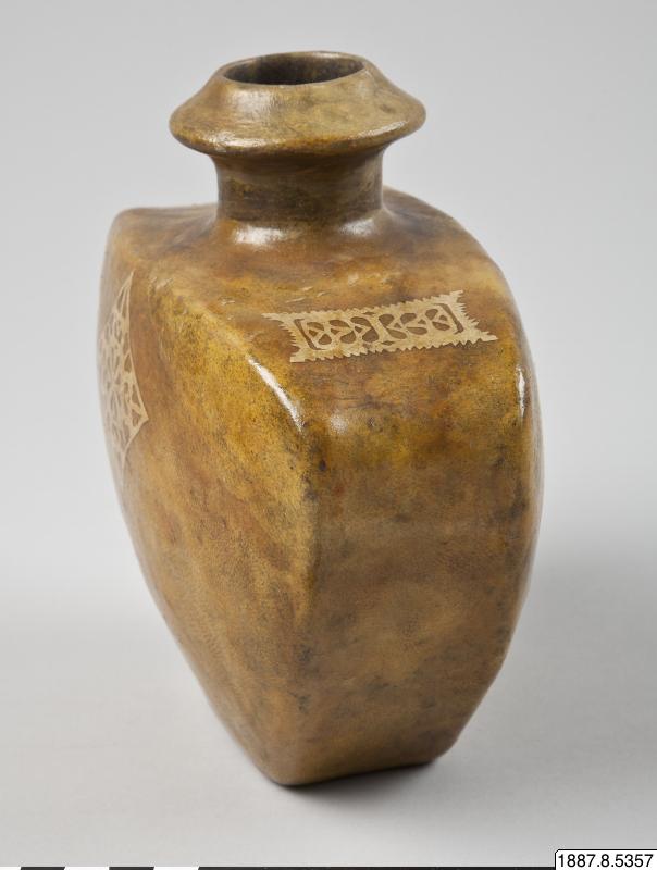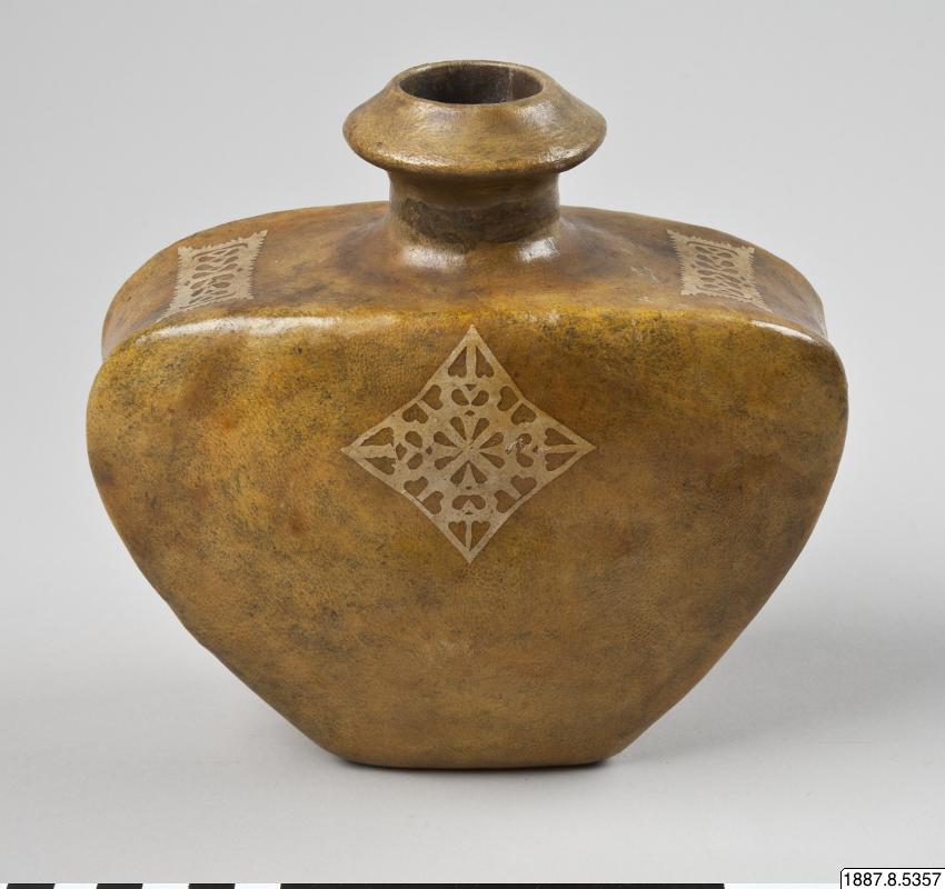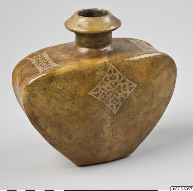 • Vattenflaska av läder, med pålagda pappersornament.