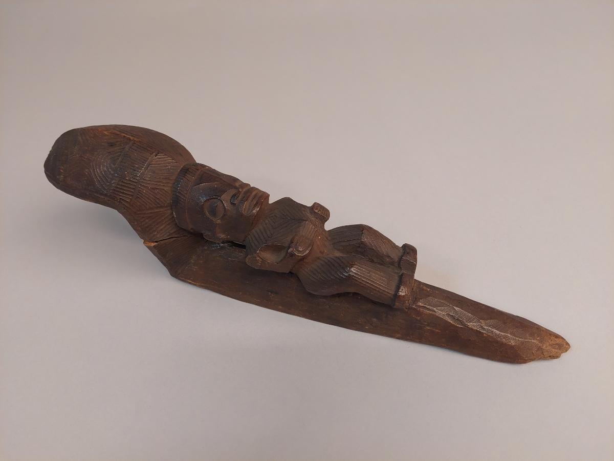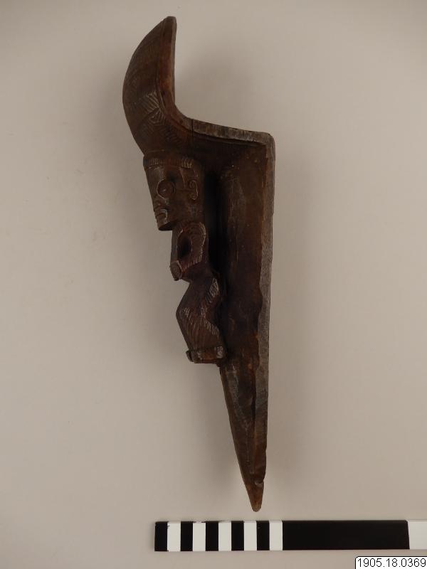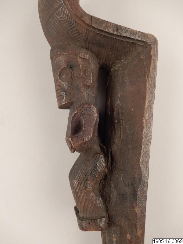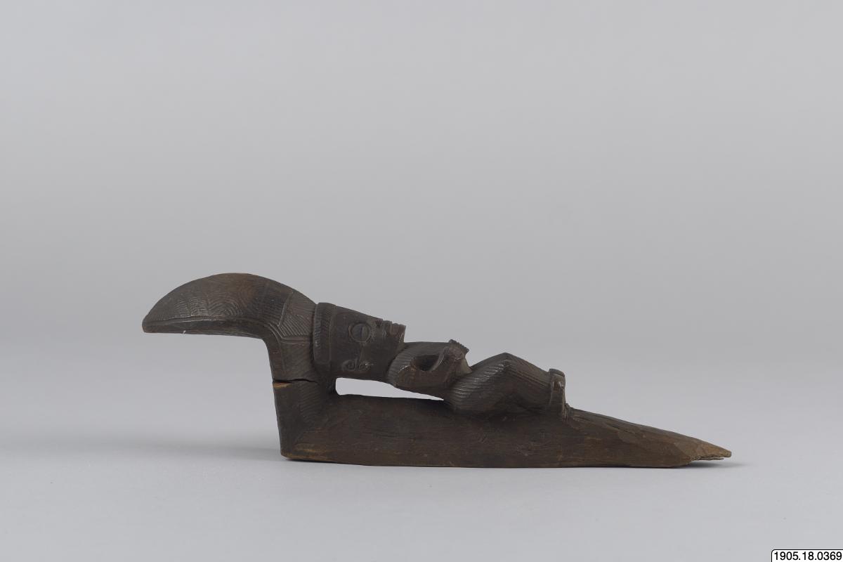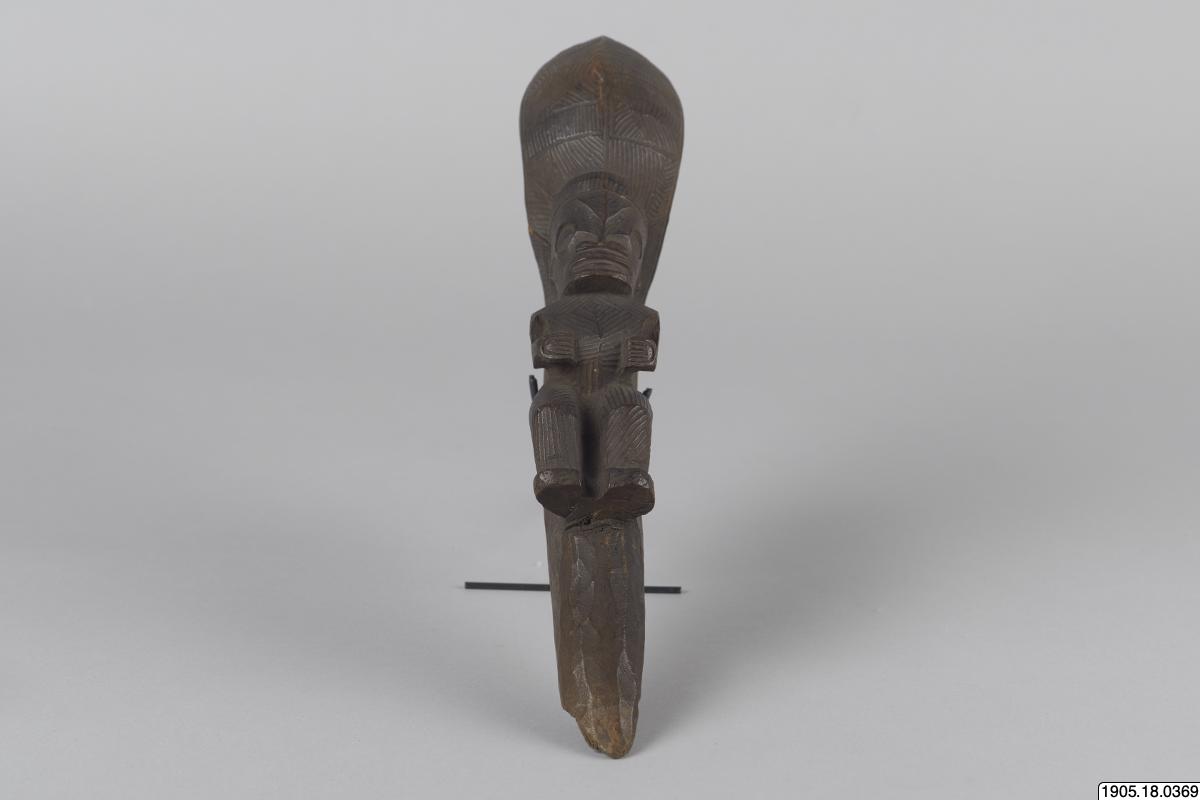 • Styltfot av svart trä, snidad. Under själva fotstödet en fri mänsklig figur med händerna emot varandra under bröstet och knäna krökta. [ocr]