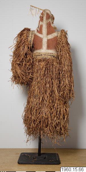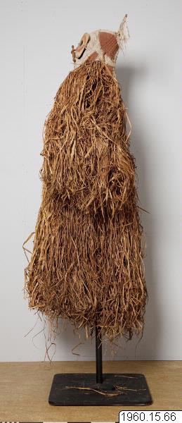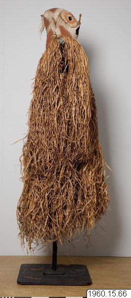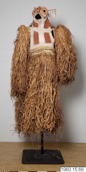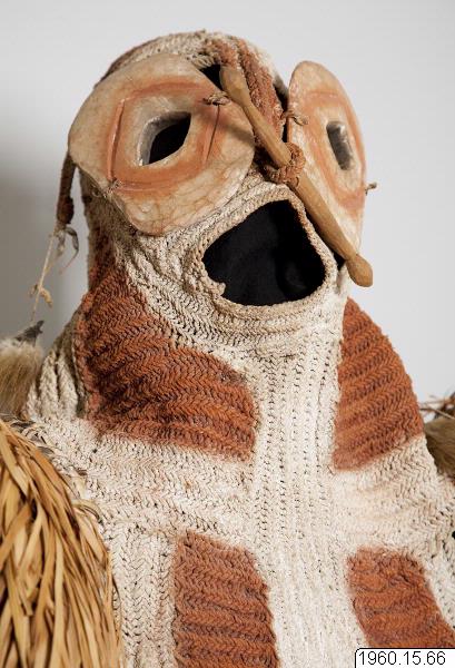 • Förfadersmask av flätad tygdel, som täckt ansikte och överkropp på bäraren. Begränsas i midjan och armhålorna av ringar av kluven bambu, från dem utgår en kjol och ärmar av långa bastband. För ögon och mun sitter två träplattor med hål i. Från hjässan sticker en pinne upp vid vilken vita fjädrar och frön är fästa. Tygdelen är målad i rött och vitt. Träplattorna för ögonen är rödmålade. (generalkat... Visa hela