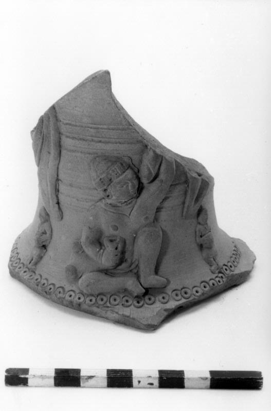 Lerkärlsfragment. Del av halsen till en stor urna. Förmodligen har lerkärlet varit av samma typ som nr 03.11.332. Vid kärlet är reliefer fästade. I mitten en figur som sitter och håller en säck av djurskinn under högra armen och sträcker den vänstra (avslagna) armen uppåt. På vardera sidan en liten stående figur, som håller ett föremål framför sig.