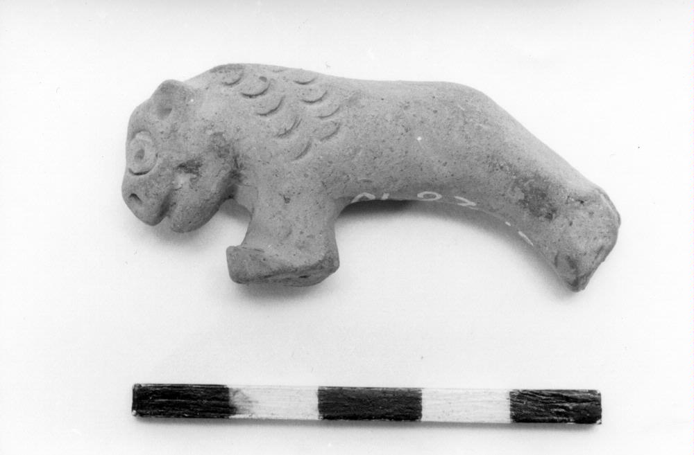 • Lerkärlsfragment. Handtag till lerkärl i form av ett lejon (generalkatalog).