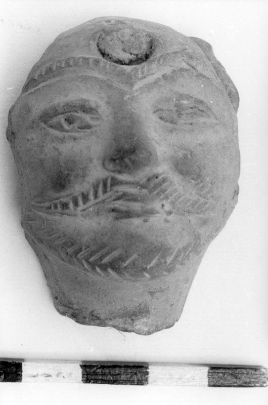 • Huvud till lerfigur. Manshuvud med kraftiga mustascher. En kaffebönsliknande fördjupning i pannan, möjligen budhistisk påverkan. På baksidan i mitten en längsgående jämn ränna, möjligen efter en pinne som haft till uppgift att ge den obrända figuren stadga.