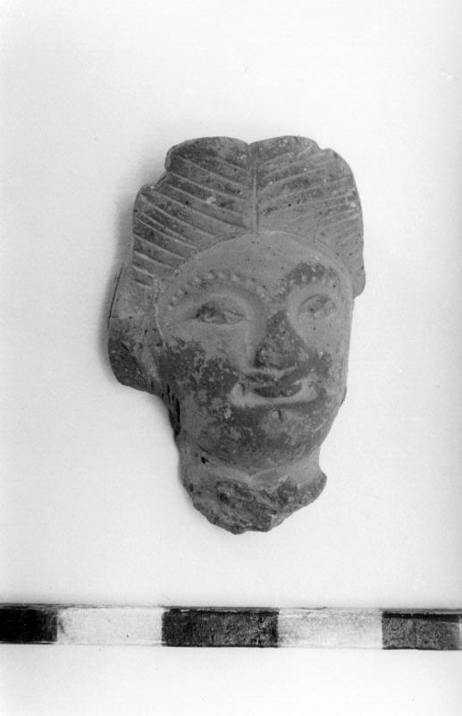• Del av lerfigur. Kvinnohuvud. Har tillhört reliefdekorationen på ett lerkärl. Ögonbrynen markerade med punkter. Hög hårprydnad (generalkatalog).