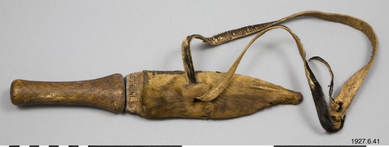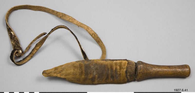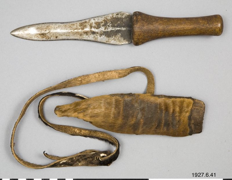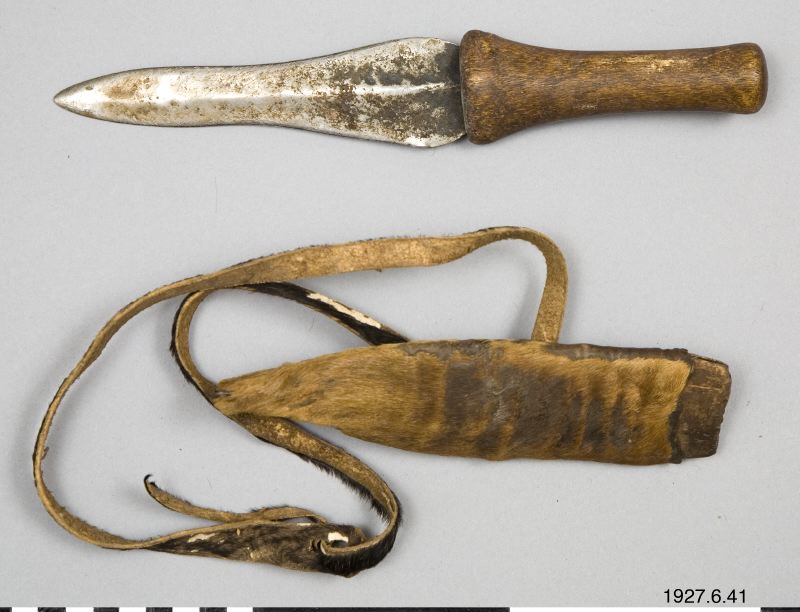 Kniv med slida. Knivbladet tveeggat, bredare vid basen, konkavt avsmalnande vid mitten och lancettformigt över spetsen (slitet). Intsucket i ett enkelt skaft av trä. Slidan löansettlik, bestående av trä inom et hölje av skinn med kvarsittande hår. Slidan bäres i en rem att spännas om livet. I remmens bredare ända ett hål för den smalare ändan eller sladden. När remmen dragits åt, slås en knut om sladden, som hindrar att denna glids ur hålet.