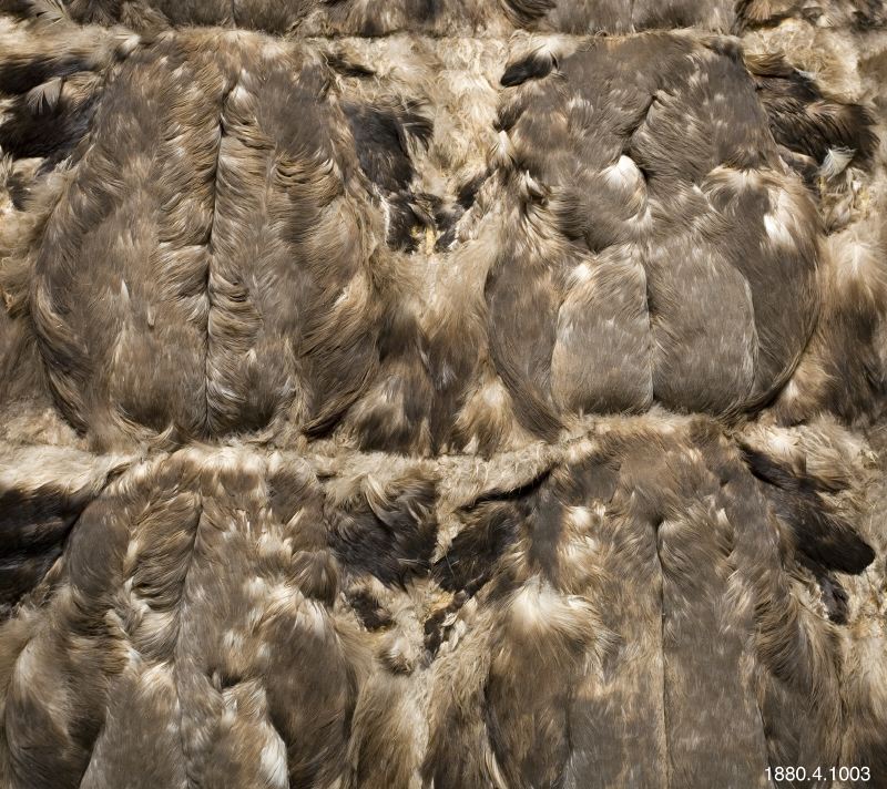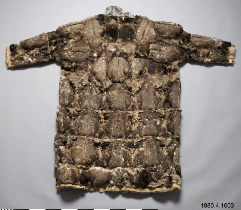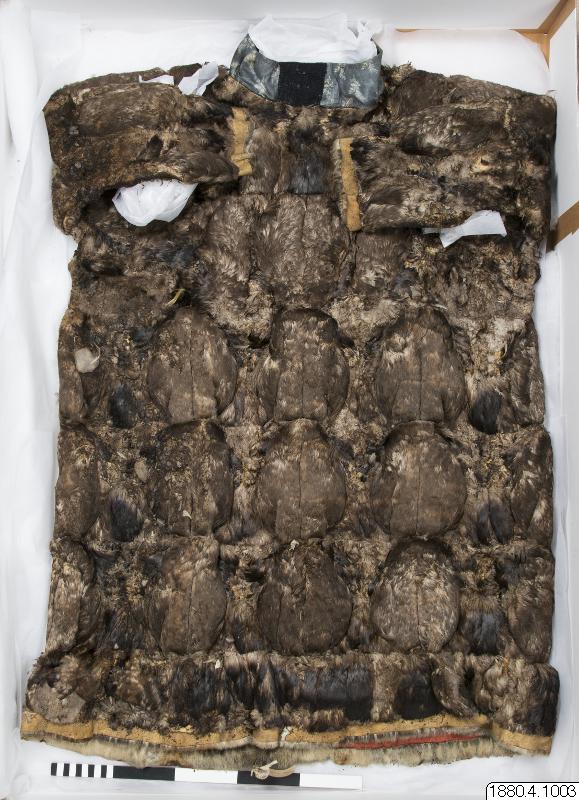 Den här typen av jackor var en gång vanliga i stora delar av Arktis. De är tillverkade av skinn från flera stora fåglar. De kvalitéer som återfinns hos denna typ av jacka - vatten- och vindtäta - är det som eftersträvas i dagens gore-tex. Denna jackan samlades in i Alaska under Vegaexpeditionen före 1880 och den är fortfarande i utmärkt skick.