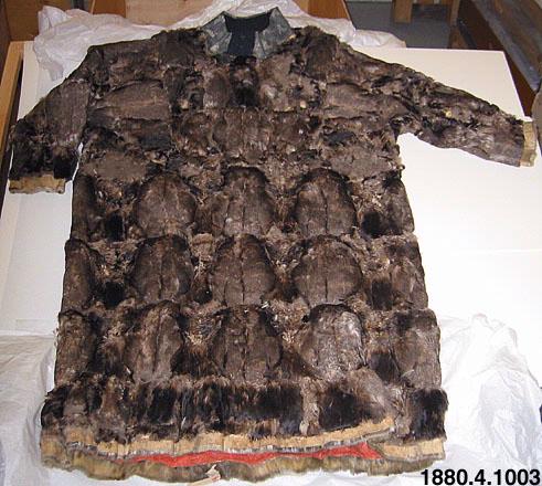Anorak hopsydd av små fågelskinn utan kapuschong, men med en ståkrage av blått kläde och tryckt blommigt bomullstyg. Röd målad kant nertill inuti samt skinnremsa. Bredd 175 cm, ärm, 86 cm, ner.