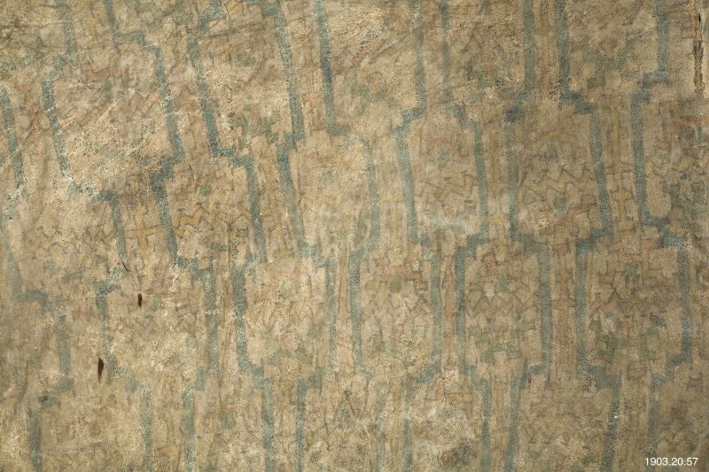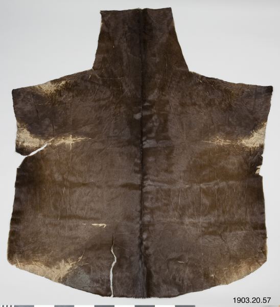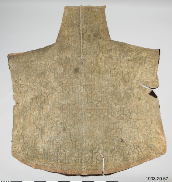 Mantel av skinn, hästhud, målad på avidsidan. Färgerna blekta; rött, grönt, blått, svart.