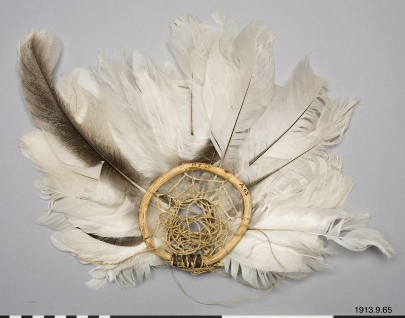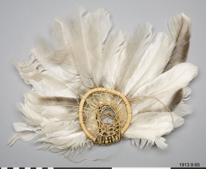Huvudprydnad för man. Mellan två ringar av trä, ljusgula till färgen och var och en bestående av en ringformigt böjd gren, hopfäst med fina, smala läderremsor av mörk färg, äro placerade radiellt, runt nästan hela ringlängden, ett större antal vita fjädrar, delvis svartskiftande. Träringarnas max. diam. ca 10,3 cm. Prydnadens största bredd 30 cm.
