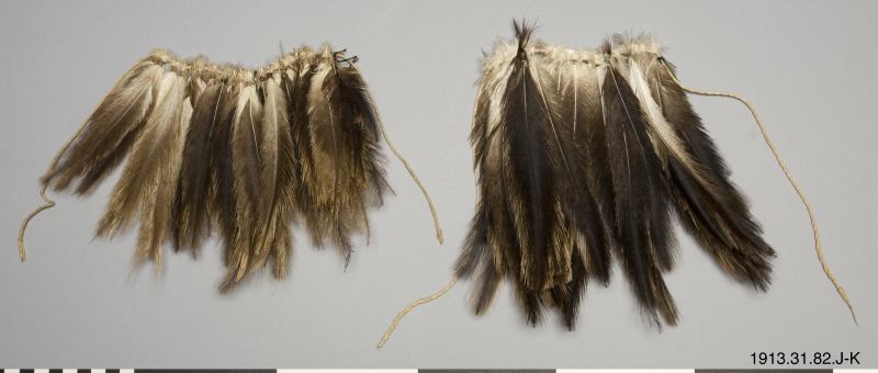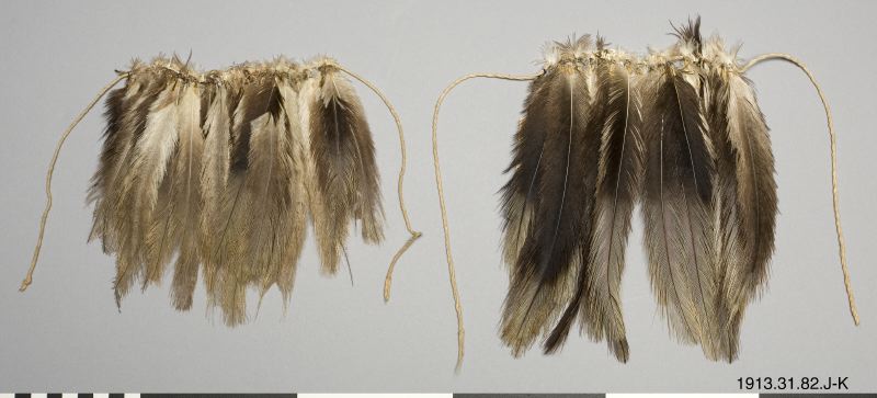 Dansdräkt, 11 delar (A-K) av frökapslar och fjädrar. Till dräkten hör en mask, nr 1913.31.0076. A-B är två snören med hängen med knippen av kluvna bruna frö- eller fruktskal. (Uppges "Utgått" i orig. katalogen) Längd 22 och 35 cm. C-K är snören med strutsfjädrar.