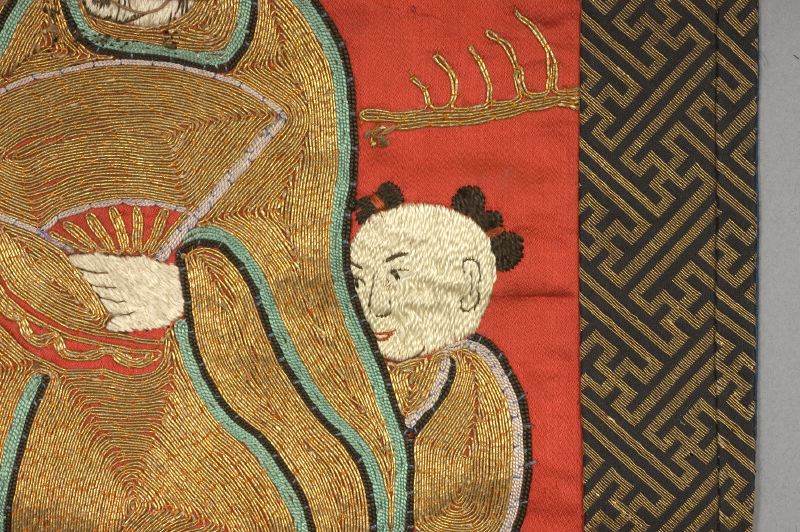 • Mansfigurer broderade med påläggsöm i guldlan på röd sidensatin. Broderiet är kantat med mönstervävt band och fodrat med blått tyg.