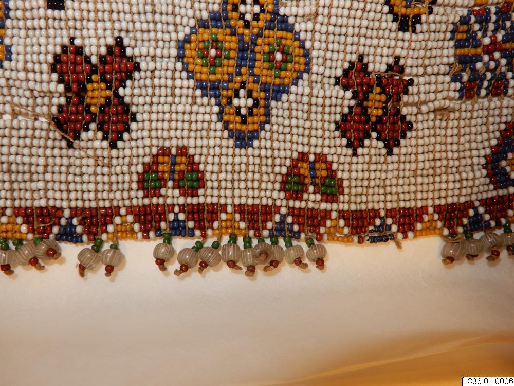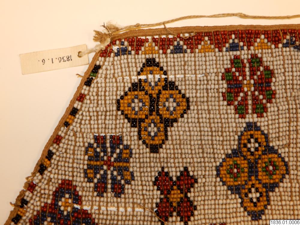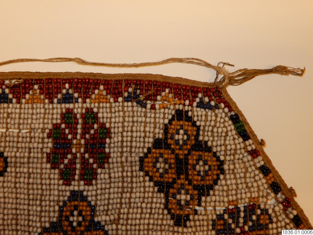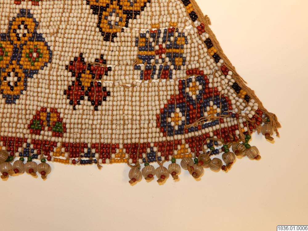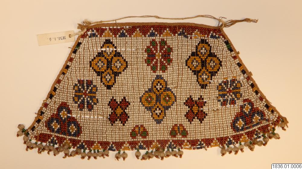 Kvinnoförkläde, Queyu eller Keu enligt katalog. Glaspärlor vävda / uppträdda på garn av växtfiber. Vitt vit botten med mönster i flera färger. Den ena långsidan längre än den andra. I överkant ett kny...