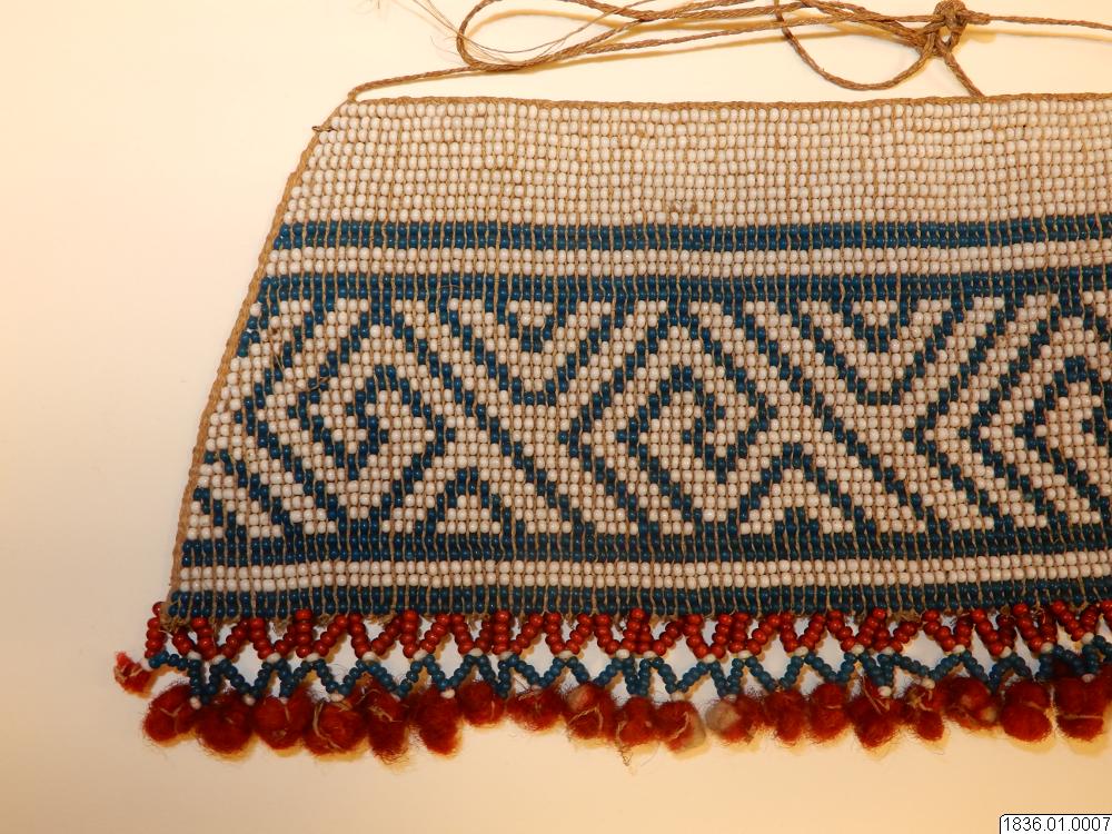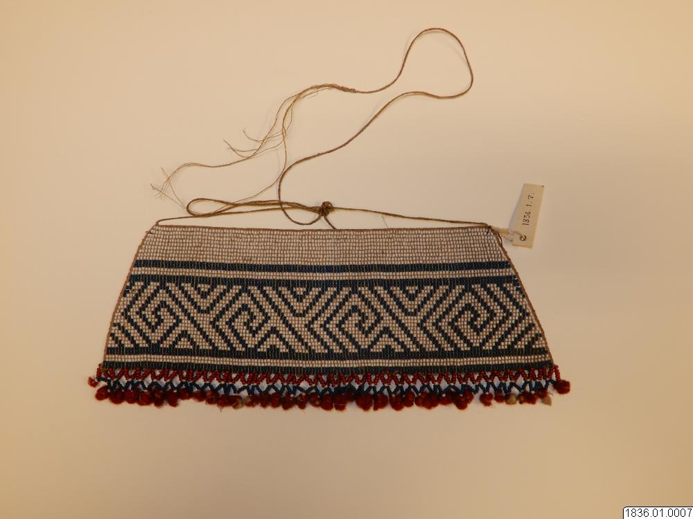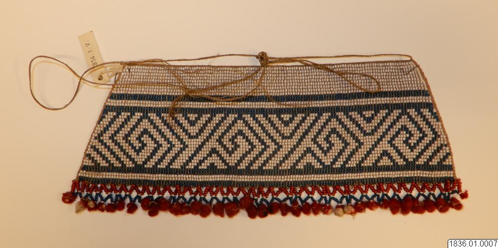Kvinnoförkläde, Queyu enligt katalog. Glaspärlor vävda / uppträdda på garn av växtfiber. Vit botten med mönster i blått. Den ena långsidan är längre och har en frans av pärlor i rött, blått och vitt, samt små tofsar av röda ullfiber. I överkant ett knytband.