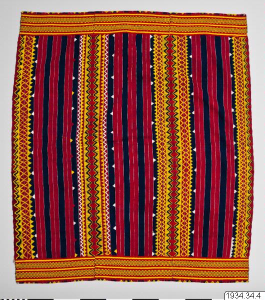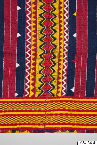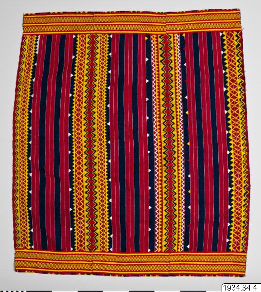 En fyrkantig textil i färgerna blått, rött och gult. I katalogen inmärkt som kjol. Bottenväven är randad i rött och blått med smalare vita ränder. I varje kortsida en bård med inslagsrips i gult och rött. Tyget är broderat med gult, rött och vitt i rändernas långdriktning. Broderierna utfört i langett- och korssöm Kanterna avslutade med langettstygn.