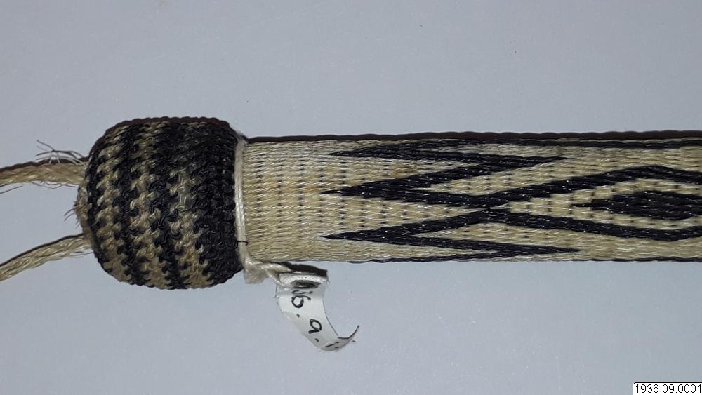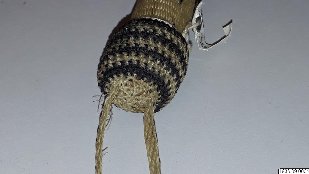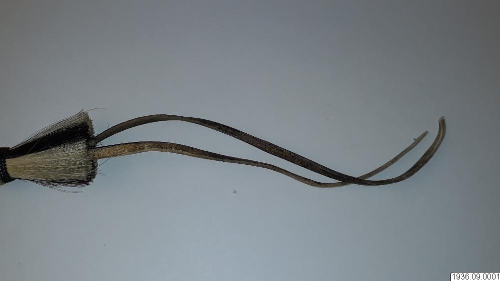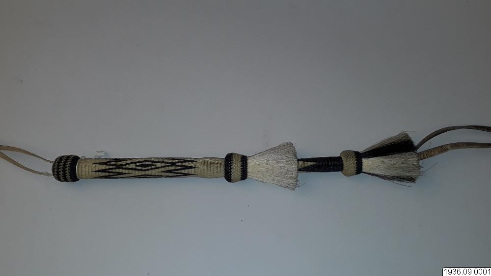 Ridpiska, består av tre partier, ett långt styvt handtag, ett kortare elastiskt mellanstycke, vid detta två läderremmar. Handdtaget, och mellanstycket är flätade av vitt och svart hästtagel. Vid handtaget en handrem av flätat vitt tagel. Dekorationer mellan handtaget och mellanstycket av öglat hästtagel i vitt och svart, och rakborstliknande toffsar.