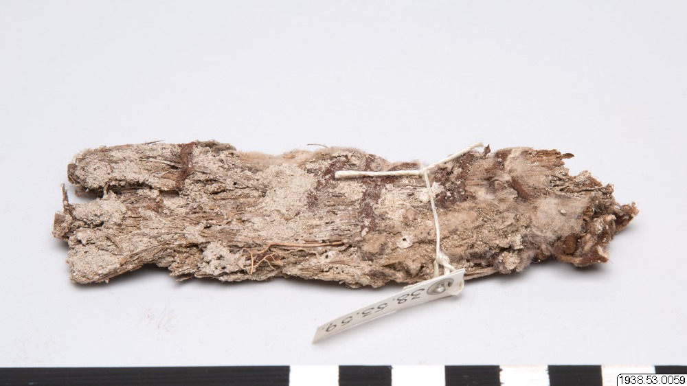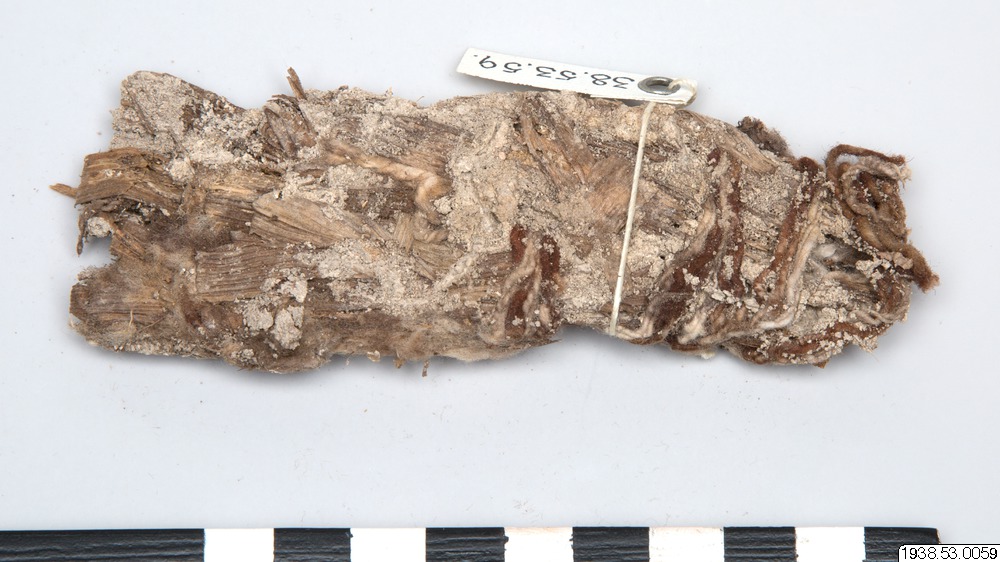 • Detta föremål tillhör en arkeologisk samling. Generalkatalogen säger dels att medicinbunten låg i en kruka, uppgrävd vid en gravplats, och dels att föremålet låg under en sten ovanpå graven. (?) Brunt bomullsgarn, löst spunnet till en tråd, hoplindat i en bunt. I bunten också hoplindat gräs och lera (?)