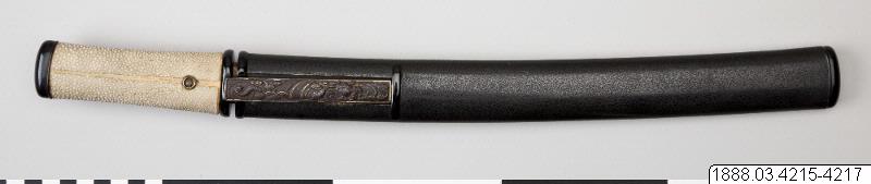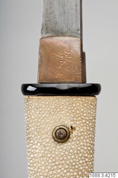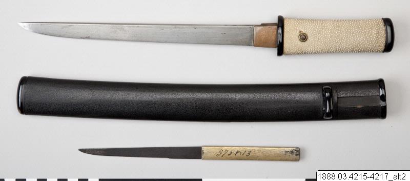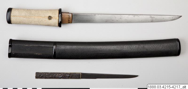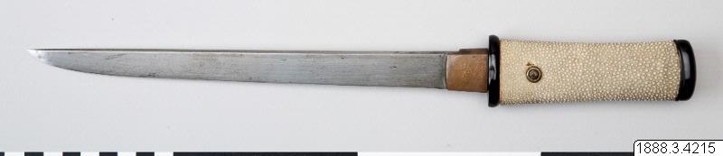 Dolk, yoroi toshi. Klinga med signerad tånge (se inv. 1867), åsad rygg. Fäste utan parerplåt, av trä klätt med hajskinn utan lindning. Nertill försett med hornring. Upptill en skålla av horn. Fäststift av trä försedda med mässingshylsor på ändarna. (originalkatalogen). Tillhör 4216 och 4217.