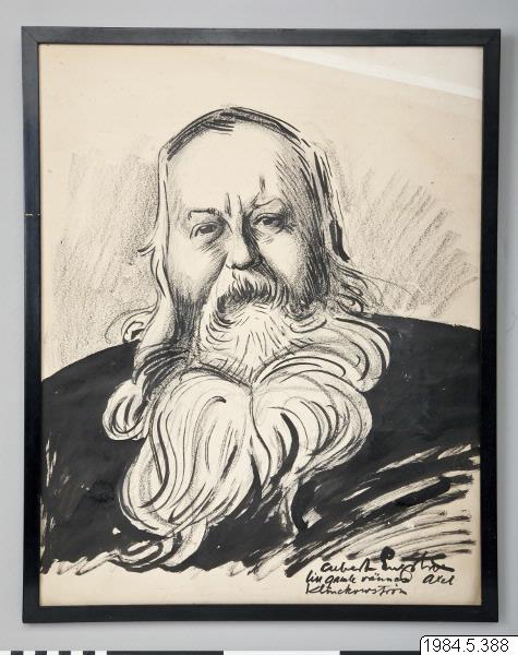 • Tavla; teckning i svart träram. Motiv: porträtt av en man med stort vitt skägg. Signerad. Text i bläck i nedre högra hörnet: "Albert Engström, till gamle vännen Axel Klinckowström.