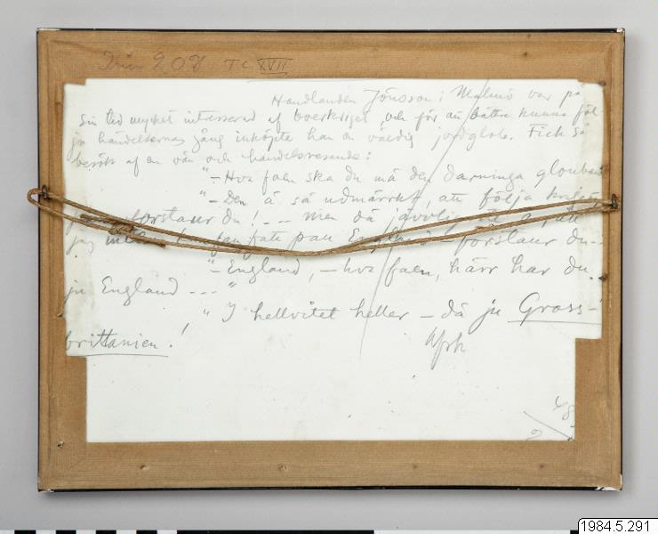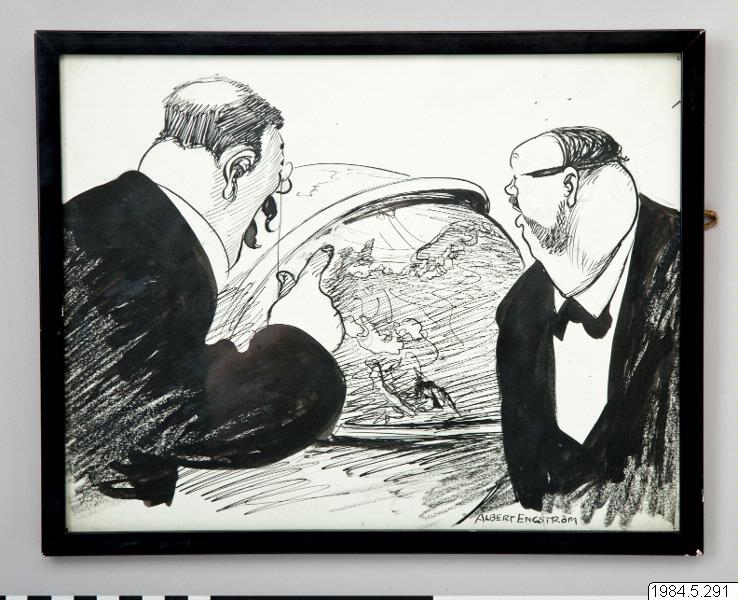 • Tavla; inglasad teckning med svart ram. På baksidan en text skriven med blyerts; skämthistoria. På framsidan ses två män studera en jordglob. Svartvit. Signerad.