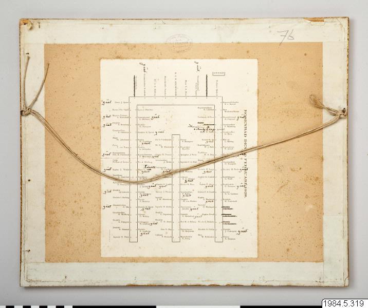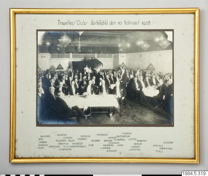 Tavla; inglasat fotografi med förgylld träram. Motiv: en stor samling män sitter kring dukade bord i en sal. Enligt text: "Travellers' Clubs årshögtid den 10 februari 1928.". Under fotografiet står namn på personerna. På baksidan av tavlan är ett papper med bordsplacering påklistrad.