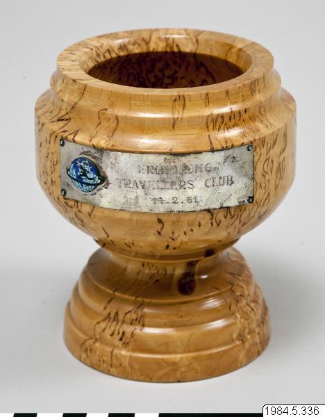 Skål på fot, svarvad. Masurträ. På skålen en plakett med skriften: "Erindring Travellers' Club 14.2.61" samt en en svart figur som springer runt en blå jordglob.