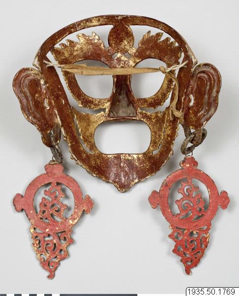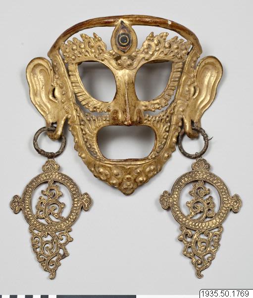 Dansmask av lackad papier maché. Framsidan är förgylld. Masken är försedd med ett tredje vertikalt öga som målats med svart. Masken har stora örhängen.
