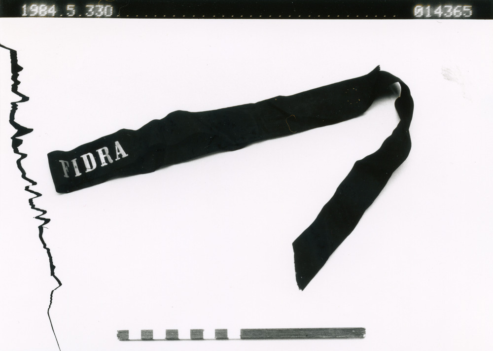 • Svart textilband med texten "FIDRA" i guldbokstäver.