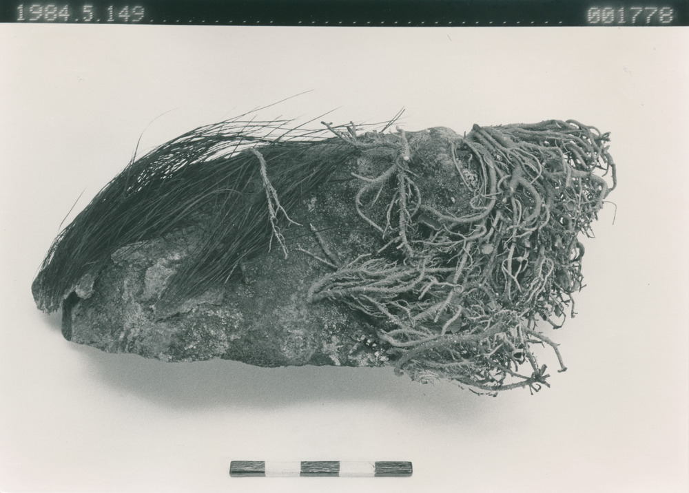 • En sten med mossa eller lav på. Även skinn med borst på, fastlimmat?