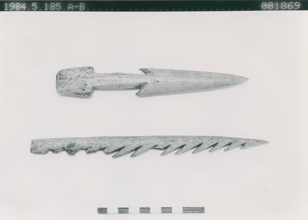 • Två stycken spjutliknande harpuner av ben.