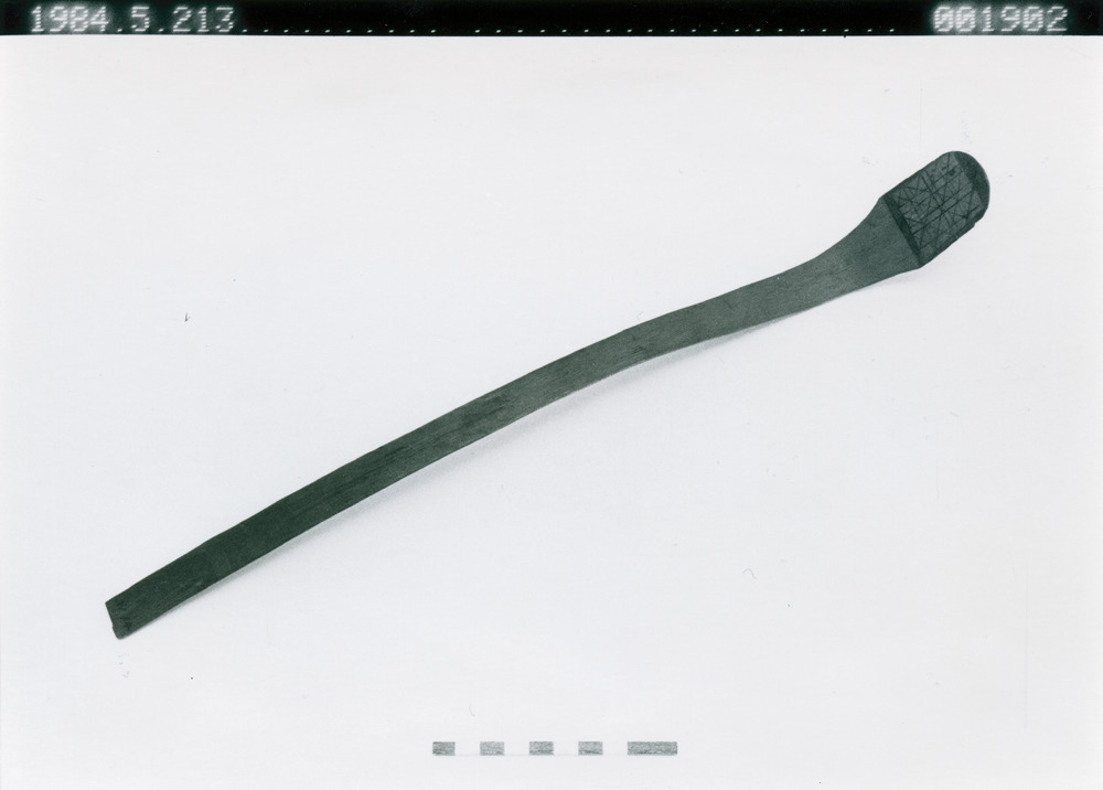 • Träföremål, eventuellt en slev? Tunt, platt, lätt s-format stycke trä med kryssmönster på nederdelen.