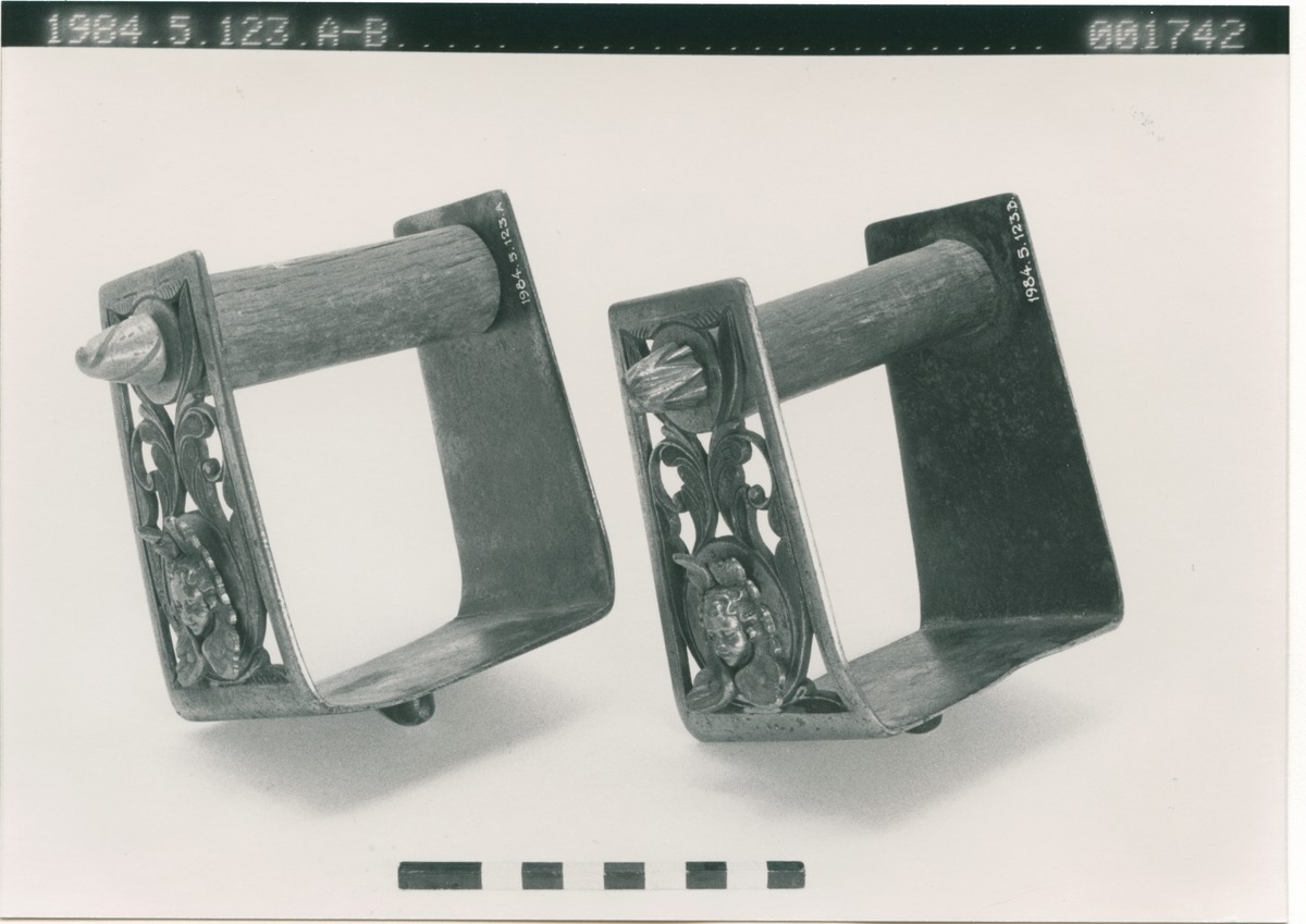 • Ett par stigbyglar av järn dekorerade med änglaansikten i gulmetall.