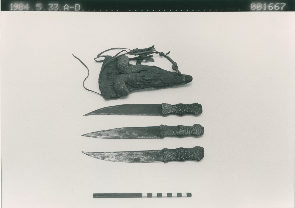 • Fodral av krokodilhud med tre knivar.