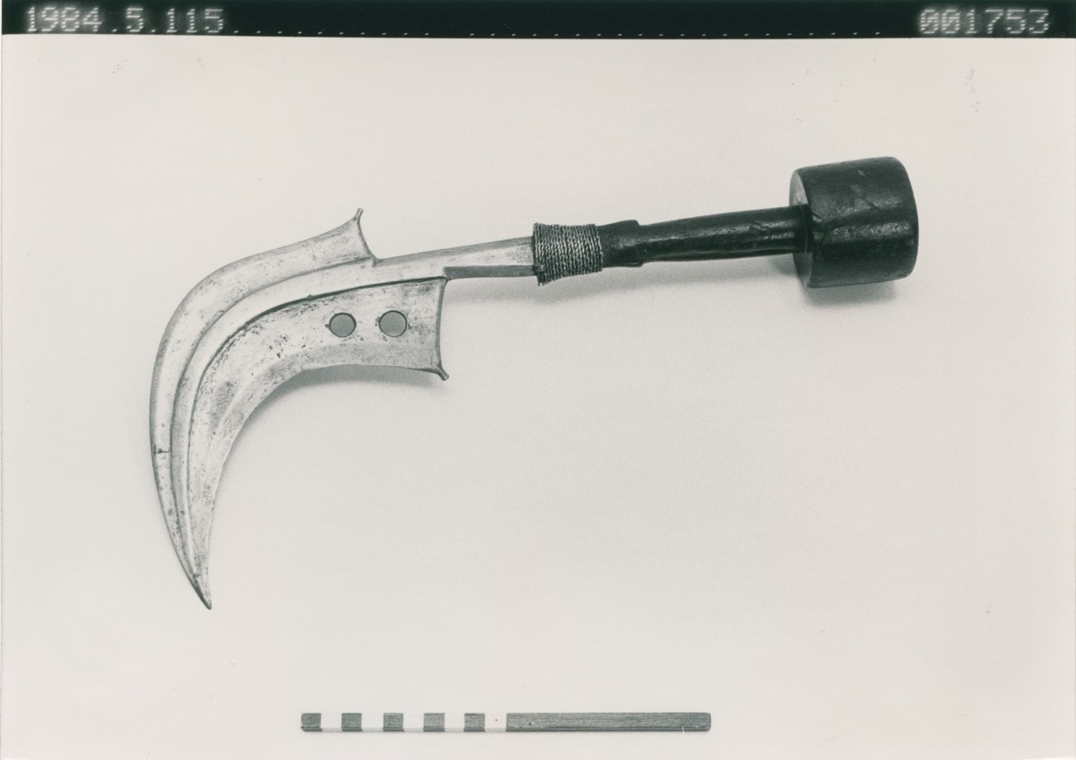 • Kniv av metall med grepp av trä. Klingan är kraftigt böjd och har stansade hål. Fästet mellan klinga och grepp dekorerat med tvinnad metalltråd.