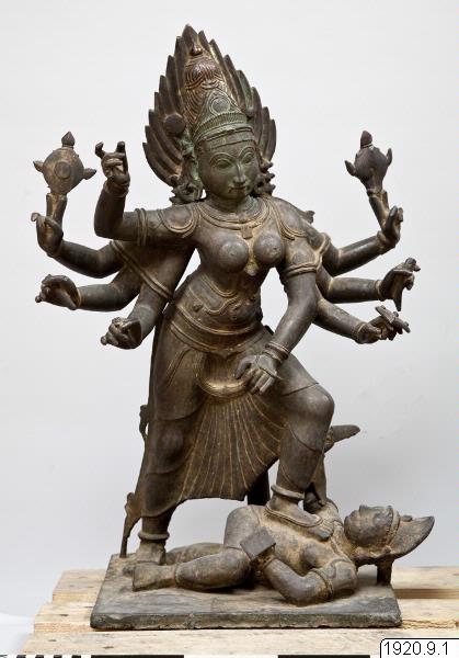 Bronsstaty av Kali (?). Har åtta armar och håller i händerna attribut som är delvis sönderslagna. Huvudbonaden är spetsig och rikt dekorerad. Halsband. Armaband, som delvis håller samman armarna. Gördel, förkläde. Står på en rektangulär platta och trampar på jätten Mahishasoura, som hon besegrat. Gudinnan bär i de två nedersta armparens händer närkampvapen, i de näst översta Vishnus symboler, till...