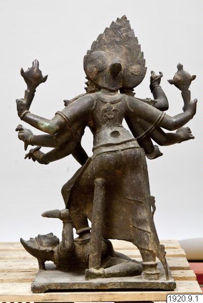 Bronsstaty av Kali (?). Har åtta armar och håller i händerna attribut som är delvis sönderslagna. Huvudbonaden är spetsig och rikt dekorerad. Halsband. Armaband, som delvis håller samman armarna. Gördel, förkläde. Står på en rektangulär platta och trampar på jätten Mahishasoura, som hon besegrat. Gudinnan bär i de två nedersta armparens händer närkampvapen, i de näst översta Vishnus symboler, till vänster musslan och till höger hjulet. Vikt 360 ser, 1 ser = ca 1 kg.