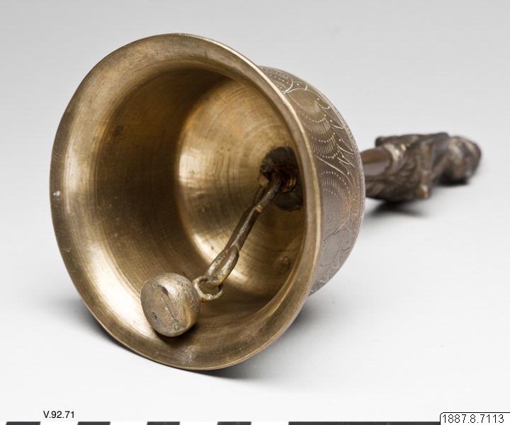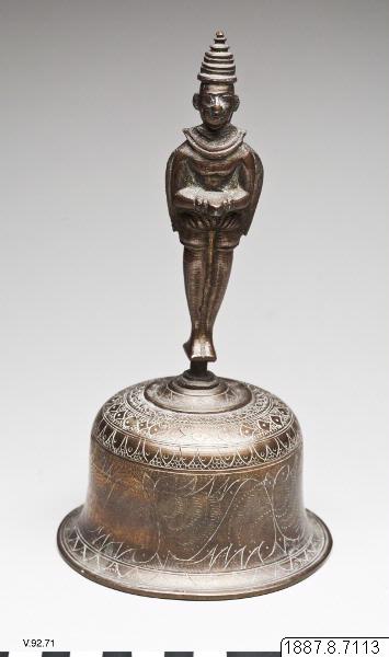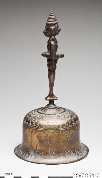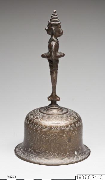 Klocka, ringklocka, vars handtag bildats av en sammansättning av Hanuman och Garuda, ståendes rygg mot rygg.