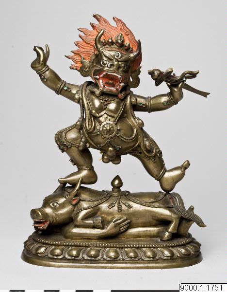 Hörnskåp 1, A. a gjuten bild af messing, föreställande Erlik Chan eller Nommien Chati, "helvetesdrängarnes eller lagens herre", (på tangutiska Schöd-schi-Tsched-sal) stående på en tjur, som ligger på en menniska; i högra banden h&ller han