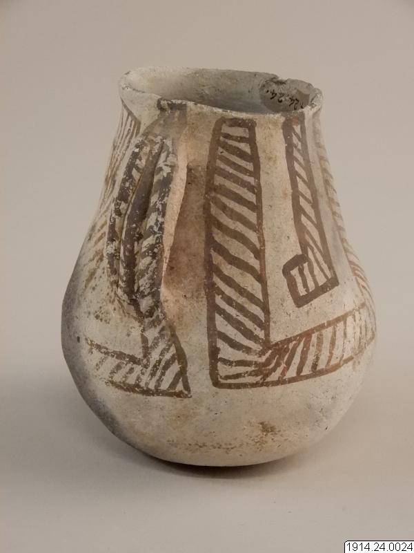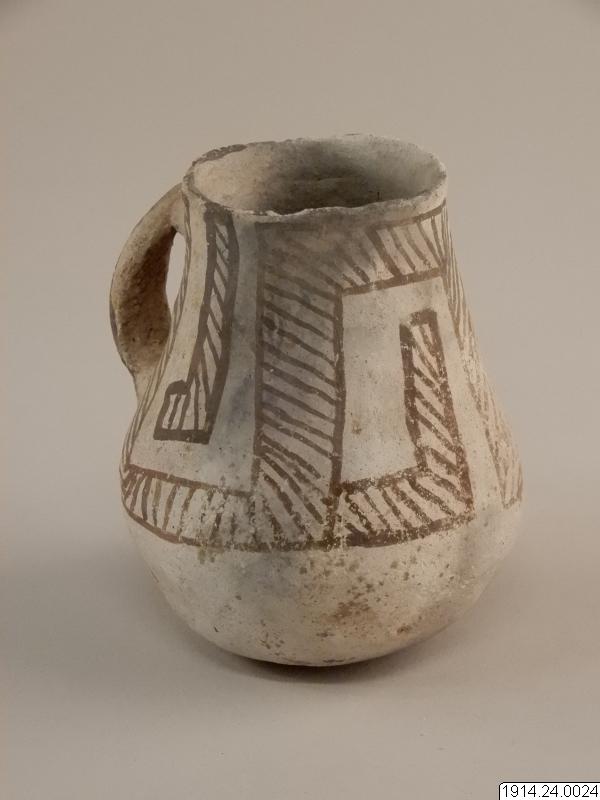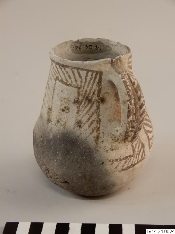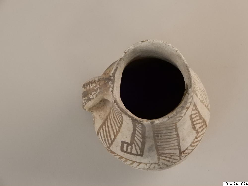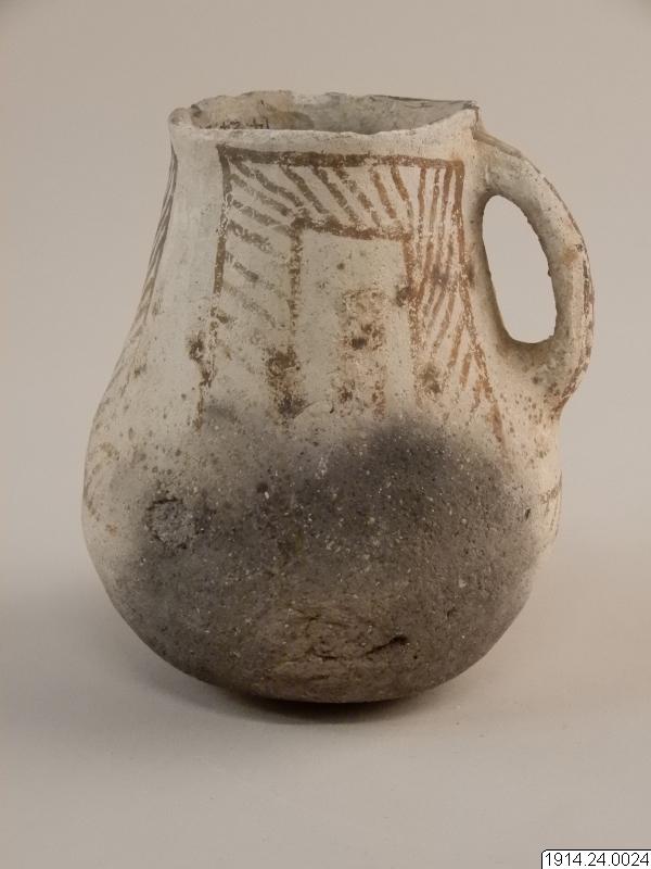 Lerkärl, kanna. Som nr.1, men örats sidokanter vulstformade. Delvis svart gods i bottenpartiet. Oskadat.