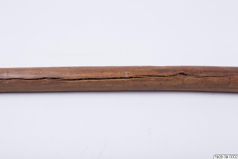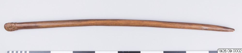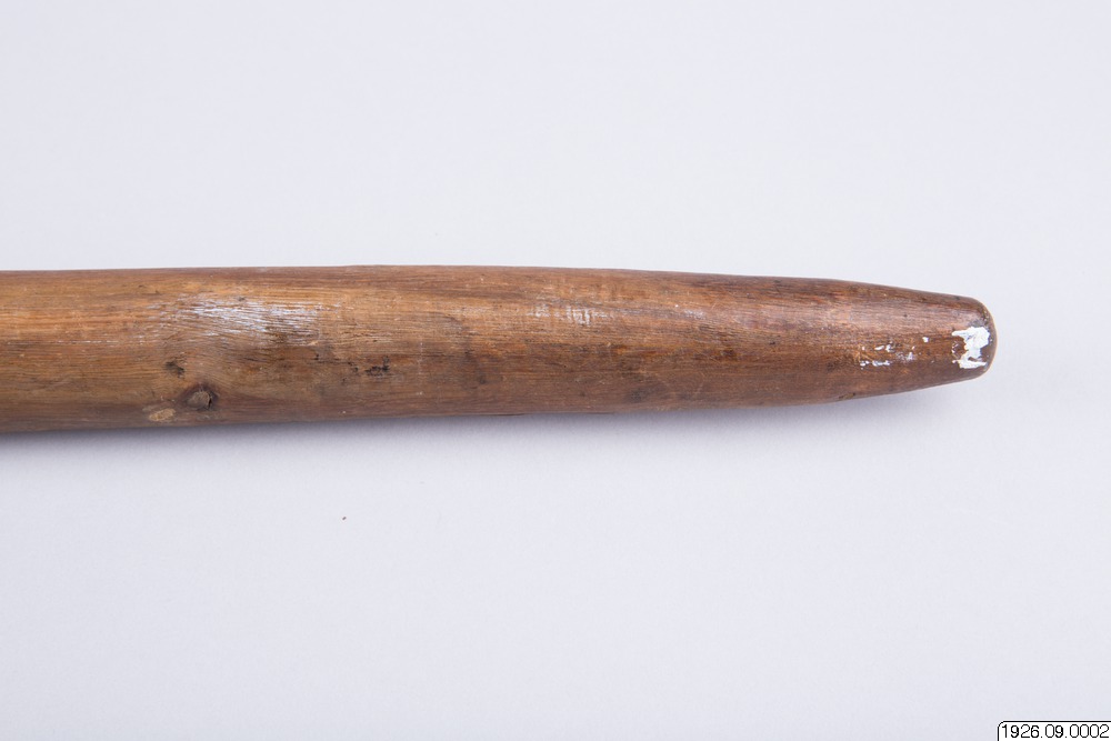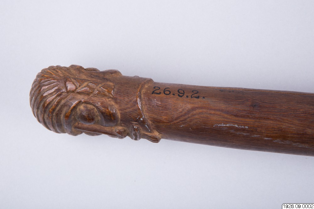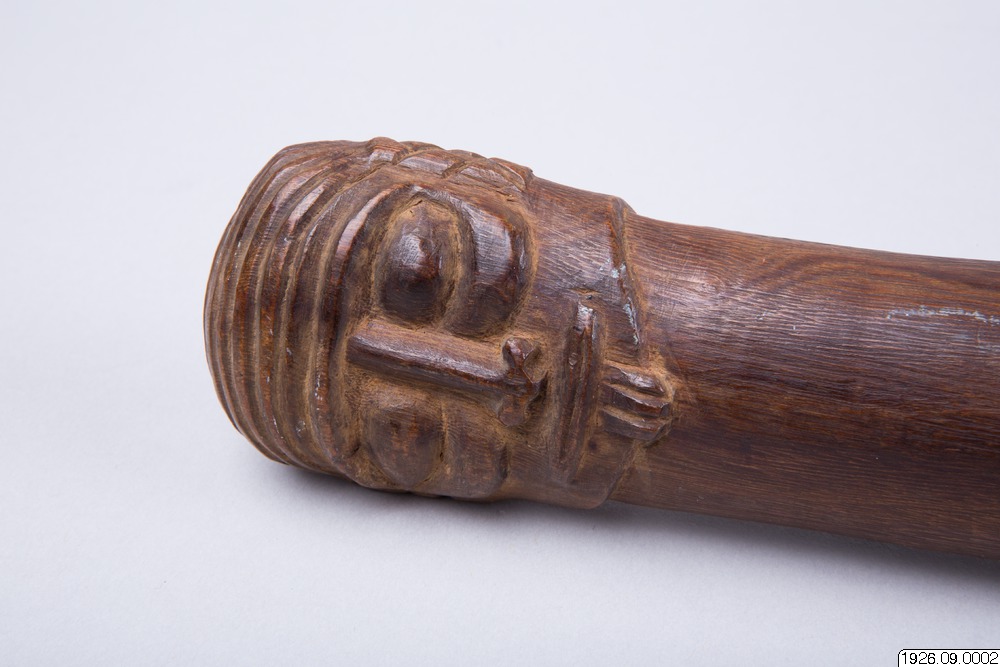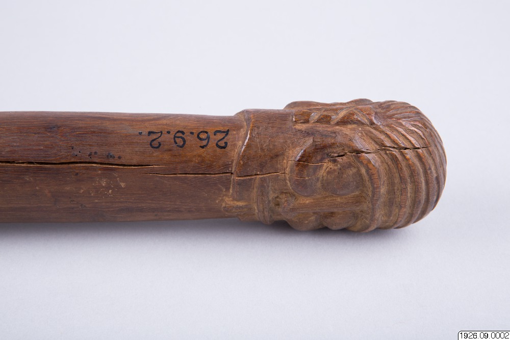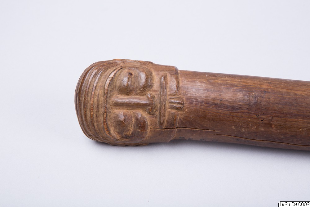 • Klubba av tungt, ljusbrunt trä. Tvenne ansikten som föregående, dock med hakskägg. Ögonen endast skurna i trä. Bladet runt (generalkatalogen).