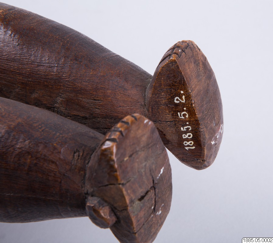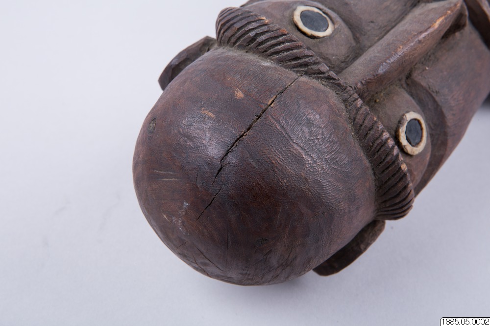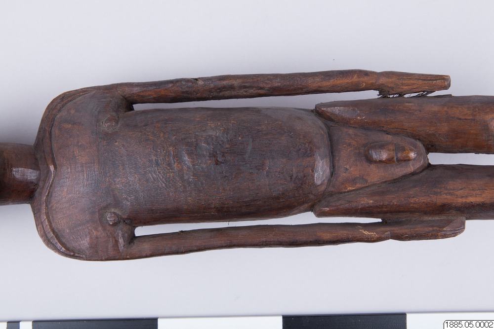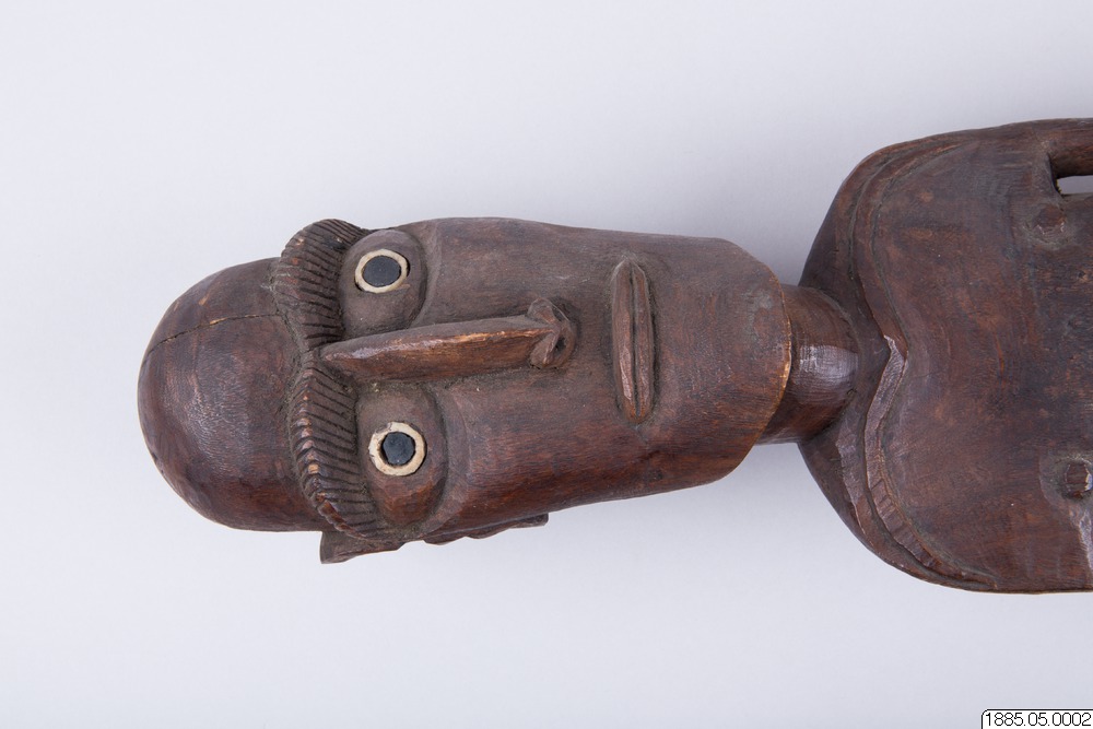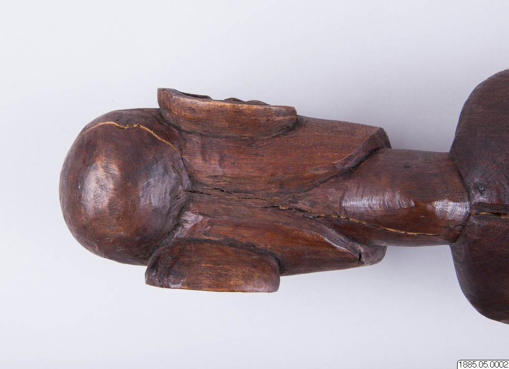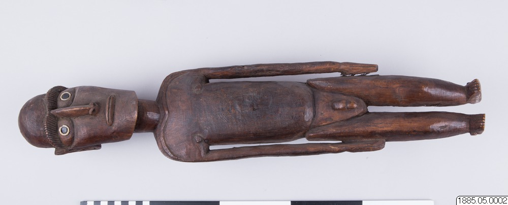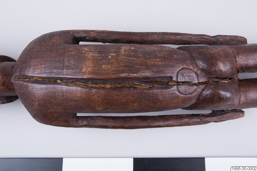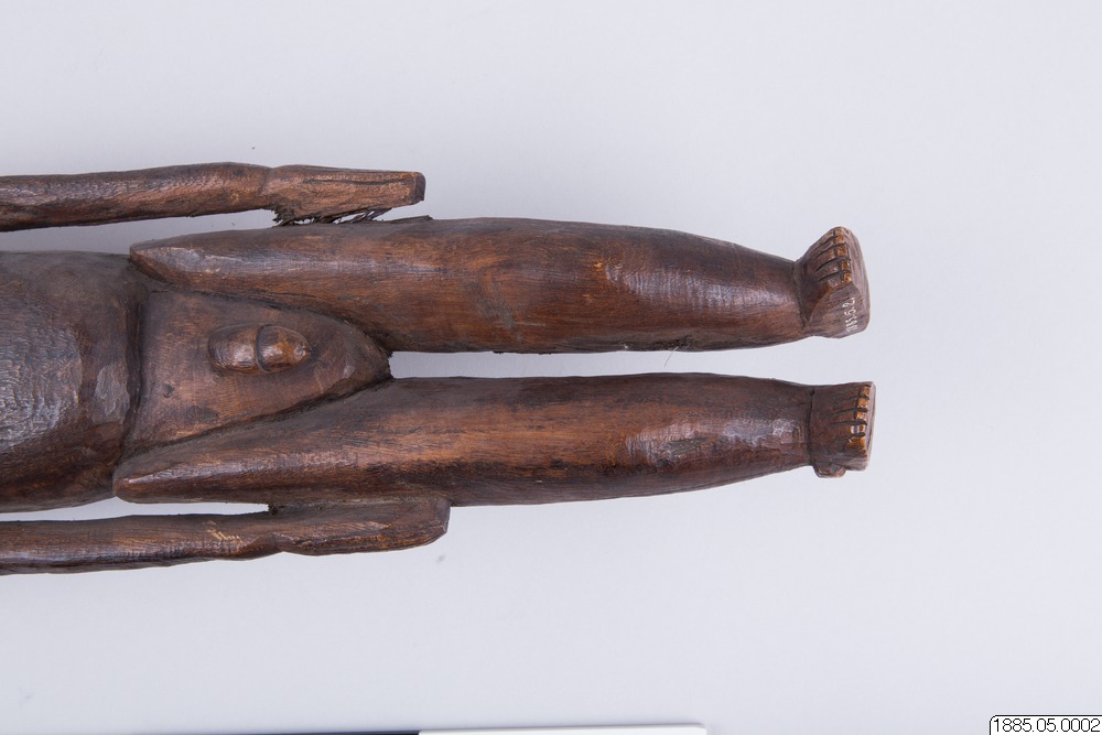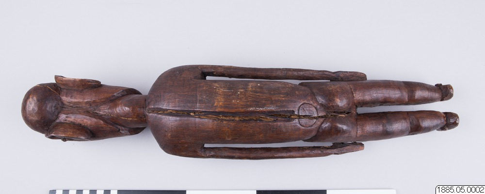 Gudabild av toromiroträ, föreställande en människofigur, hållande de mycket långa armarna utefter sidorna. Ögonen av runda obsidianplattor, omgivna av ringar av mussekskal. Sprucken. Inlindad i ett stycke vit tapa. (generalkatalogen)