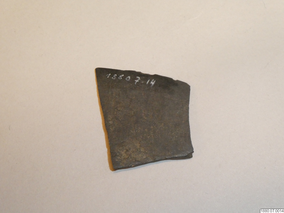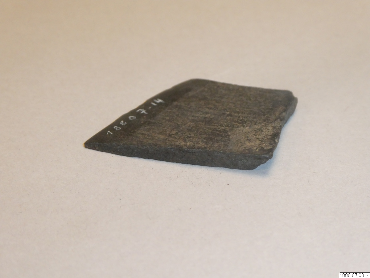 Stenkniv. Liksom föregående, men liten, med tämli~ ojämn,. bakkant. Svart, poleradt skiffer. Längd 3,7 cm, Bredd 3,1 cm. Tjocklek 0,4 cm. Irkaipij. (generalkatalogen) [ocr]