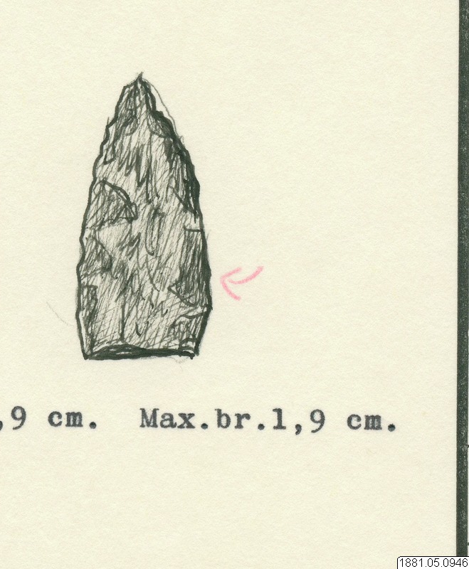 • Som nr. 944 men något -ljusare bergart. Länt& 3,9 cm. Max.br. 1,8 om. [ocr]