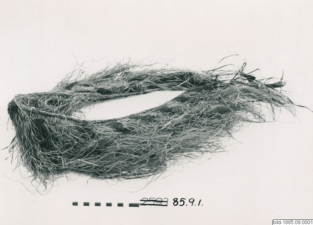 Gördel av bast, gu1, med svarta inflätade bast knippor, knytes med långa ändar av svart och gul bast. (Orig. kat. nr. 2593) Längd utom ändarna 90 cm. Bredd: omkring 40 cm. [ocr]