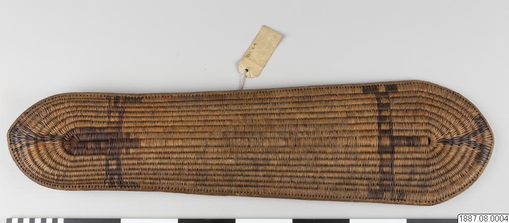 Denna flätade och ovalformade sköld, med en något avsmalnad mitt som dekorerats med svart motiv, är troligtvis tillverkad på Floridaöarna Nggela eller vid Guadalcanal (provins på Salomonöarna). Skölda...